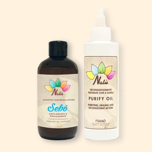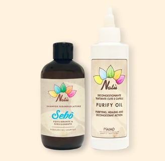 L’Olio purificante esfolia e prepara la cute a ricevere tutte le proprietà riequilibranti dello Shampoo Riequilibrante.